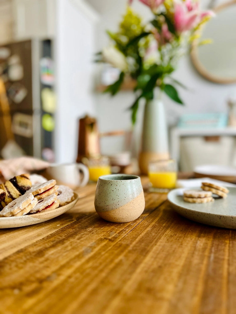 Sip in style with this handcrafted ceramic cup, finished with a unique criss-cross texture and organic white glaze. Perfect for espresso, cortados, or small pours, each piece is microwave and dishwasher-safe for everyday use. No two are alike — slight variations in color and size make every cup one of a kind. Made to order in the U.S.; please allow up to 4 weeks for shipping.